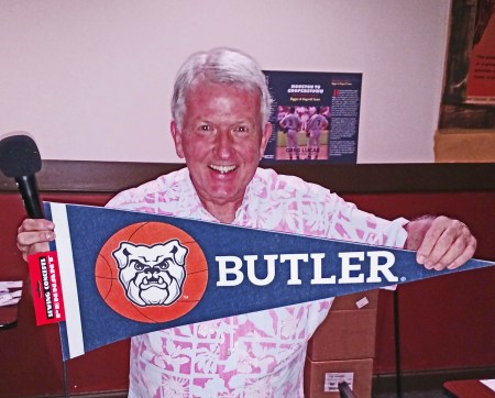 - “Catching Casey!” This was a “just for fun” activity. We wanted to give Greg Lucas a chance to catch up with Casey Stengel by allowing him to simply, one-by-one, look at a bunch of college pennants I had purchased for this exercise and match them with members in our SABR meeting group. Each correct identification counted as a “pennant won” – and Greg got to award that pennant that he just won for the right person as their gift. – With a little help, Greg Lucas got it done. Casey Stengel won a monster number of 10 pennants in 12 seasons (1949-60) with the Yankees. Greg Lucas won only 9 pennants, but, cut him some slack, Greg did his work in only 15 minutes. How’s that for efficiency? – Thanks to new “Jim Dandy To The Rescue” member Kevin P Rosell, we also have pictures of them all. Unfortunately, I did not receive the photos of Larry Miggins (Pittsburgh) or Bob Copus (Sam Houston State), but here are 6 of the others I did receive from Kevin by e-mail. The picture up top of Greg Lucas counts as one also. Then there were the 2 photos that didn’t get here. – Those bring Greg’s total pennant captures to 9. This whole “Catching Casey” fun thing took about 15 minutes, as we said, and then, of course, the night concluded with the usual trivia quiz. Mike McCroskey designed the quiz, but wasn’t present to administer it. Forgive me this sin too, but I never even heard who won. I will put my dime down now that it most probably was Tom White, our unbelievably resourceful “Handy Vandy” baseball history answer man.