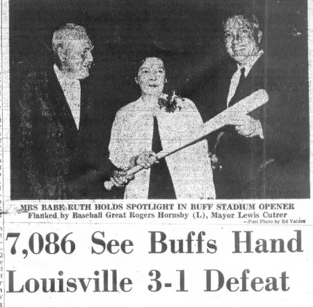 An unfortunate failure of the public address system ruined the audio portion of the pre-game ceremonies honoring the memory of Ruth, what with short speeches by Mrs. Claire Hodgson Ruth, the Babe’s widow, and Mayor Lewis Cutrer heard by only a few of the fans. Youngsters of the Babe Ruth League surrounded the diamond and the Buffs and Colonels were lined up along the first and third base lines.