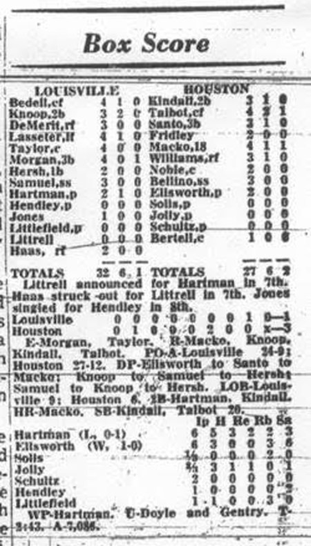 SLAUGHTER RELIEVED Ellsworth with Lefty Marcelino Solis staring the seventh, but after retiring one man, Solis walked Hersh and Samuel in succession. Quickly, Enos called in Jolly, who responded by fanning Pinch-hitter Eddie Haas and inducing Howie Bedell to ground into a forceout to end the inning. Gene Littrell had been announced as the hitter for Hartmen, but when Slaughter switched to the right-handed Jolly, Manager Ben Geraghty of the Colonels switched to the left-handed hitting Haas.
