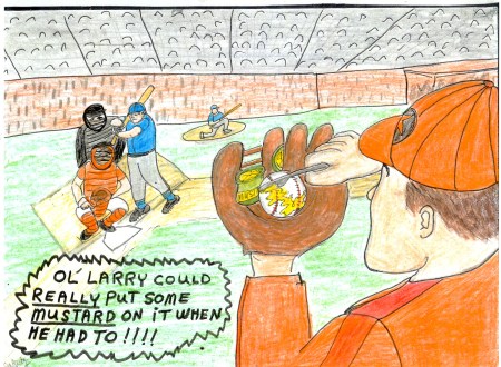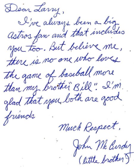An Artful Homage to Larry Dierker from my 75 year old “little” brother, John C. McCurdy. John and his lovely wife Linda of nearly 55 years live in Beeville, Texas, north of Corpus Christi, where both are quite active in our old McCurdy roots town before our family moved to Houston on December 31, 1942. John is a genuine curmudgeon and one of the loudest complainants in South Texas over the rarity of Astros baseball over these rural system baseball delivery programs. Apparently you need to have Direct TV to get all the Astros games at home. With cable, you have to wait for the Astros to come up on the Rangers telecasts to see them play live at home. – At any rate, my little brother John is a passionate and talented cartoonist too. He drew this cartoon and sent it to me with the following inscription about a month ago. I have been saving it until the next time I saw Larry, but decided today to send it this way. – You will get the original in person, Mr. Dierker, at either the June SABR meeting – or at our next luncheon together, whichever comes first. Hope you enjoy the talent, the intentionality, and the effort that Brother John put into this piece. I know your career meant a lot to him as one of the surviving original Houston MLB baseball fans.