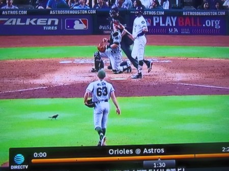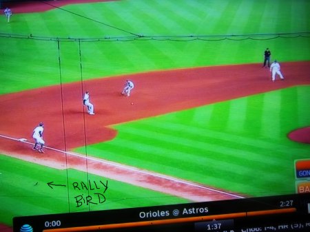 Rallybird turned out to be an Astros on-the-field bench jockey: “Hey! Orioles pitcher! Are you any kin to that soccer ball in the old Tom Hanks plane crash survivor movie? …. “Hey! Orioles pitcher! Do you ever feel like you’re losing control of the ball just as you get to the release point?”
