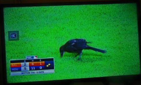 It didn’t take long for Rallybird to both assert his casual “don’t bother me none” attitude as he calmly strolled under the arch of 90 MPH pitches and 105 MPH batted balls as he also dined on the nourishment he pulled dragging from the lush green grass. And, as the Astros scored a cushion run to pad their lead to 5-2, shouts of “Go Rallybird” seemed even to have emboldened the little guy to expose more of his own fan bias for the Astros over the Orioles. – We all could see the risk that Ral was taking. – One hard body slam from a a batted or pitched ball and it was going to be “Bye Bye Birdie” on the spot.