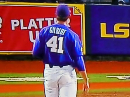 “NOW PITCHING FOR THE LSU TIGERS …. # 41 …. GILBERT …. CALIB GILBERT …. NOW PITCHING! …. FOR LSU!”