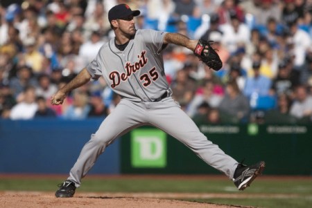 Detroit Tigers pitcher Justin Verlander works against the Toronto Blue Jays during fourth inning of a baseball game in Toronto Saturday, May 7, 2011. (AP Photo/The Canadian Press, Darren Calabrese)