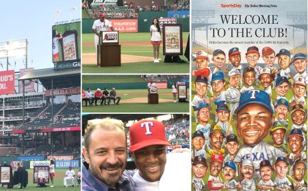 The Texas Rangers duly honored third baseman Adrian Beltre last weekend for his 3,000 hot passage season. In the process, one of our wonderful Pecan Park Eagle contributors, artist Michael Hogue, also was reflectively honored for that magnificent graphic he did of Beltre in the new company of all the other 3,000 hit club members to date.