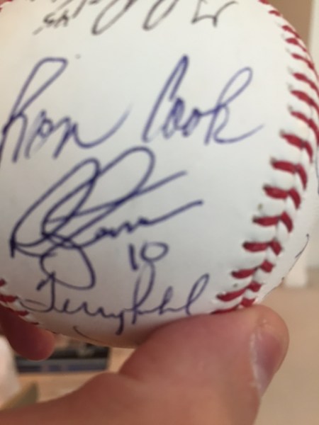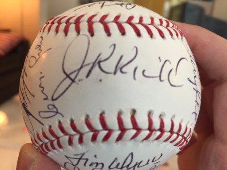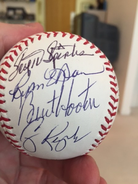 The story begins at the silent auction on the floor of SABR 44, held at the Sonesta Hotel in the Galleria section of Houston back in 2014. A tall man with a moustache wearing an autographed St. Louis Cardinals jersey was presiding over the silent auction items on Thursday. His name was Jim Kreuz and he asked if I were interested in any items. The array of prizes included autographed baseballs from Derek Jeter and Mariano Rivera, a piece of the original Astroturf from the Astrodome, and the first pitch at the SABR game. And there was a baseball that caught my eye.