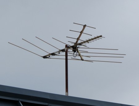 To receive early TV pictures from the broadcast tower, you had to have a roof antenna like this one or a simple set of “rabbit ear” receivers wired to your TV on the inside of the house.