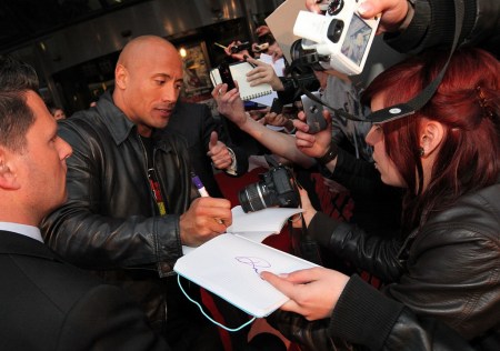 Martian star, KLGTZX PQTZ, (Dwayne Johnson) and agent Scott Boras (foreground, left, facing PQTZ) signs with the New York Yankees.