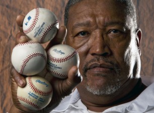 J.R. Richard holds up four baseballs, one for each of the four wins he racked up as a a five-time home opener starting pitcher for the Houston Astros from 1976 to 1980.