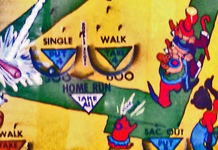 Under the lower left side, the part yjat’s covered by the glove in the first photo, there was lever you pulled that propelled the little silver pin balls, one at a time, up the release channel and onto the field. Pulled at full strength, the ball shot on an arc around the top and then bounce off off a metal piece that was designed to carry it bouncing all over the place. Over time, you learn what it takes to reach that tiny space between the two large “U” spaces marked above here as “single” and “walk” as a “home run.” I did reach a point in which back-to-backs were not uncommon. Not bragging. Any kid with good finger dexterity and my capacity for obsession could also do it.