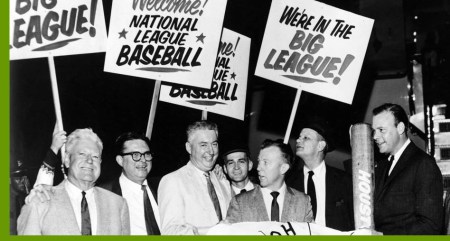 On October 17, 1960, at the annual Major League Baseball owners meetings in Chicago, Houston and New York were awarded expansion club franchises as members of the National League. Judge Hofheinz and His HSA crew were there to receive the news in person and later pose for the featured photo shown here. The two new teams would begin play in 1962 as the Houston Colt .45s and the New York Mets.