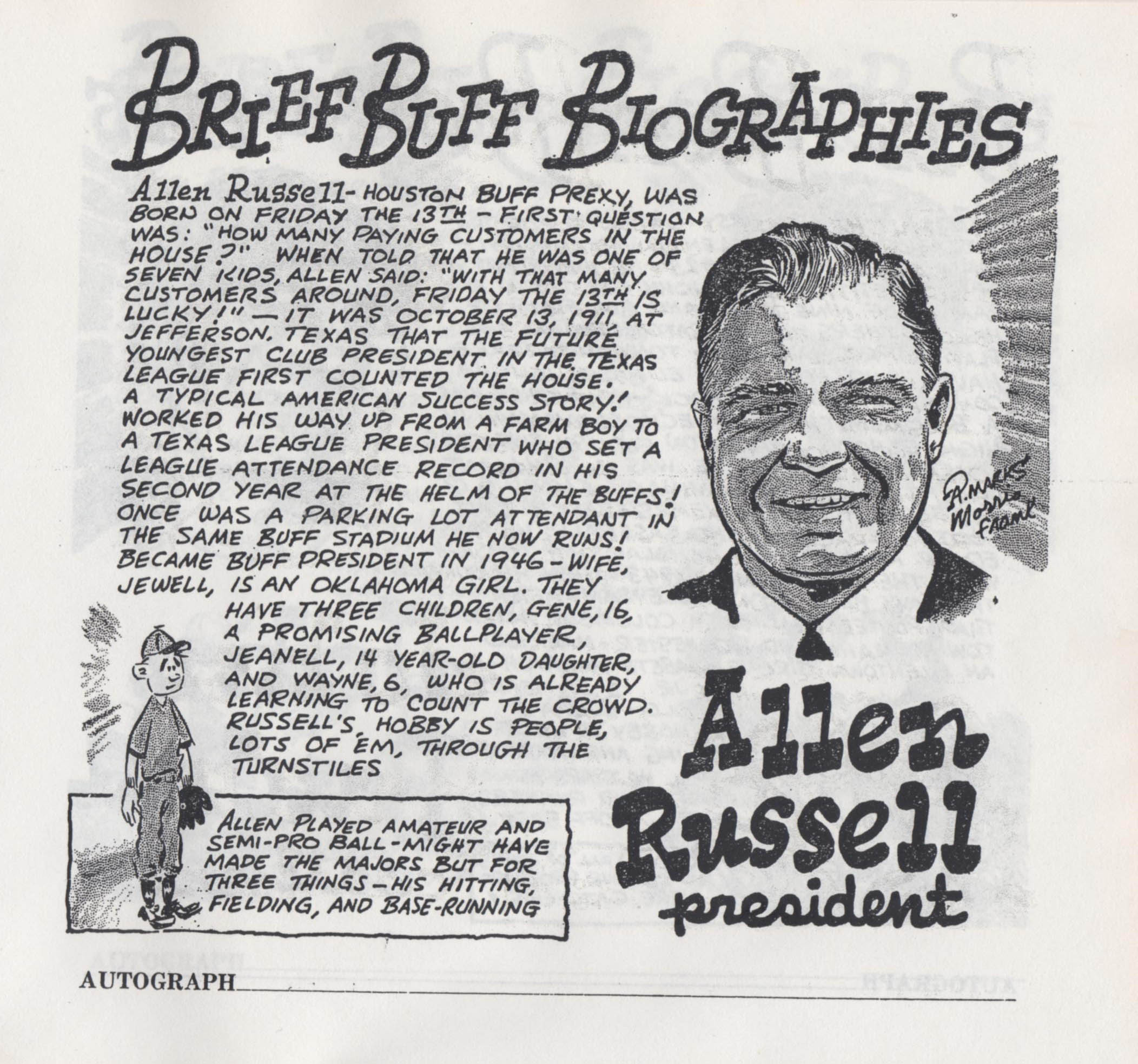 Years ago, my good friend Jerry Witte, the late slugger of Houston’s 1951 Texas League champions, told me this supportive story of how fine-tuned Allen Russell’s pulse was to factors effecting game attendance. This is not my point, but we already know that Russell installed the first air-conditioned ladies room in baseball because he recognized that “comfort” was big as a factor in attracting more women to Buffs games. No need to cool the men’s room. The guys will come to the ballpark, regardless. Always have. “But we have to make it nicer for the ladies,” Russell boasted.