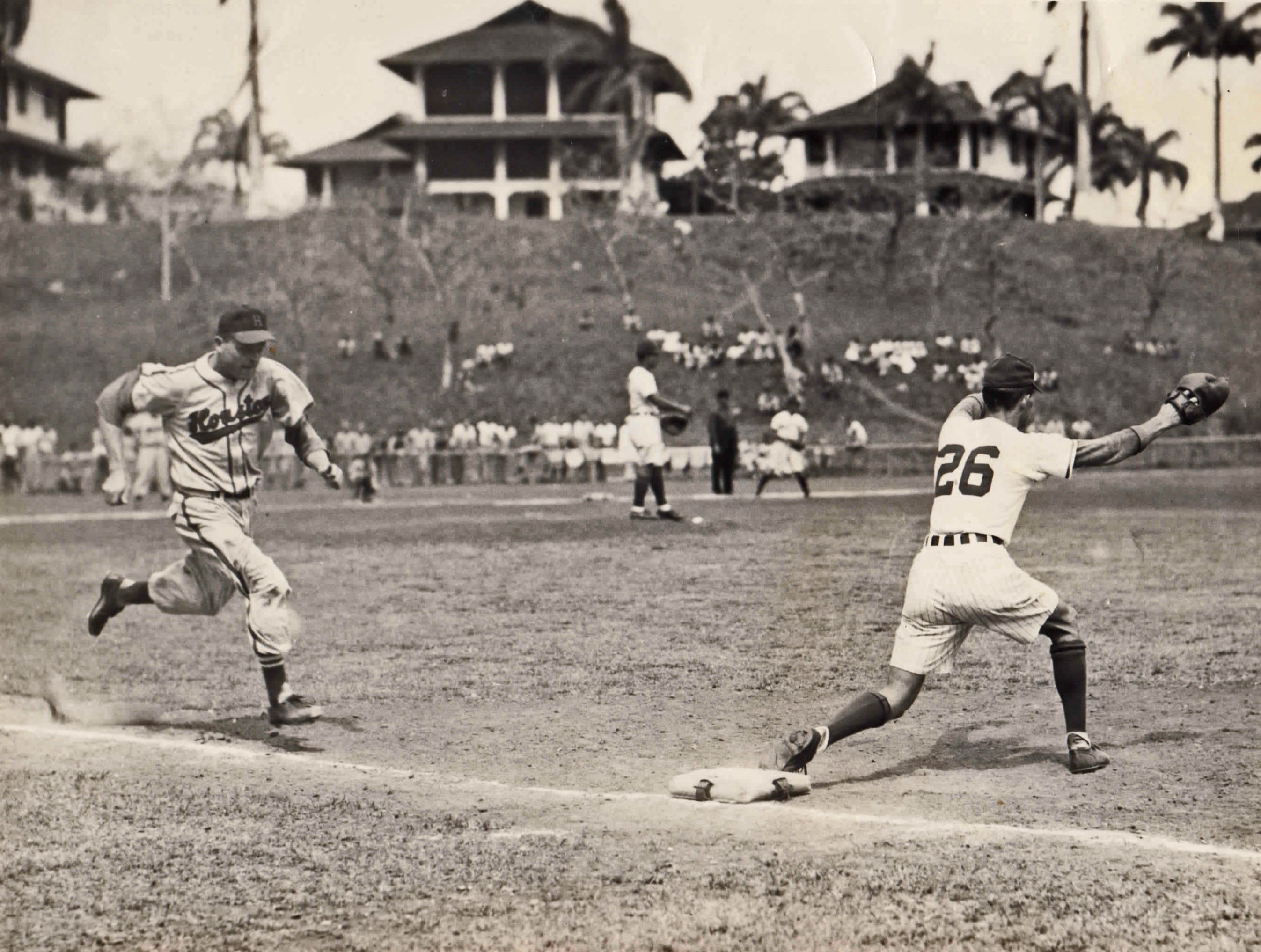 In the spring of 1951, the Houston Buffs trained in Panama, playing several games against the Albrook U.S. Air Force Base Flyers. Here we see a now unidentified member of the 1951 Buffs legging out a ground ball in a game in which the Flyers wore their cool short pants leg uniforms. It looks too much like Larry Miggins to not be him, but for one thing: Larry says he wasn’t assigned to the Buffs in 1951 until after spring training and that delay by the Cardinals caused him to miss the trip to Panama. By the way, the Flyers also had a conventional baseball outfit they wore, but living near the Equator made the brief version popular.