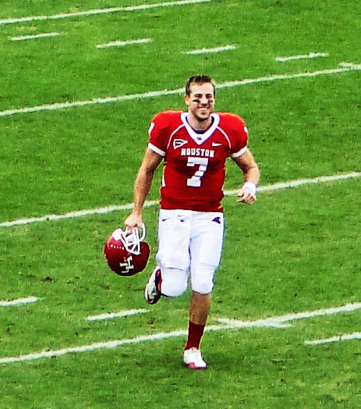 Now, as for all those collegiate records, do you know what he did? His passing records are mostly held by a statistical landslide. And these are not the distances that come only from a “systems” accomplishment. As an individual player, Case Keenum had three influential head coaches in college: Art Briles, the coach who recruited him went on to do the great things he is continuing to do at Baylor – and that includes taking UH recruit Robert Griffin III with him to Baylor when he left for the Waco job. It was a move that set RGIII on the road to his 2011 Heisman Trophy award. Then came Kevin Sumlin to UH and he and Keenum took the Cougars to its biggest winning season in history in 2011. Then Sumlin left for Texas A&M where, in 2012, he became the 2nd former UH coach in two consecutive years to be responsible for Heisman Trophy winners when Johnny Manzeil won it for himself and the Aggies. Tony Levine became Keenum’s third college coach for one victorious bowl game victory over Penn State at the end of the 2011 season.