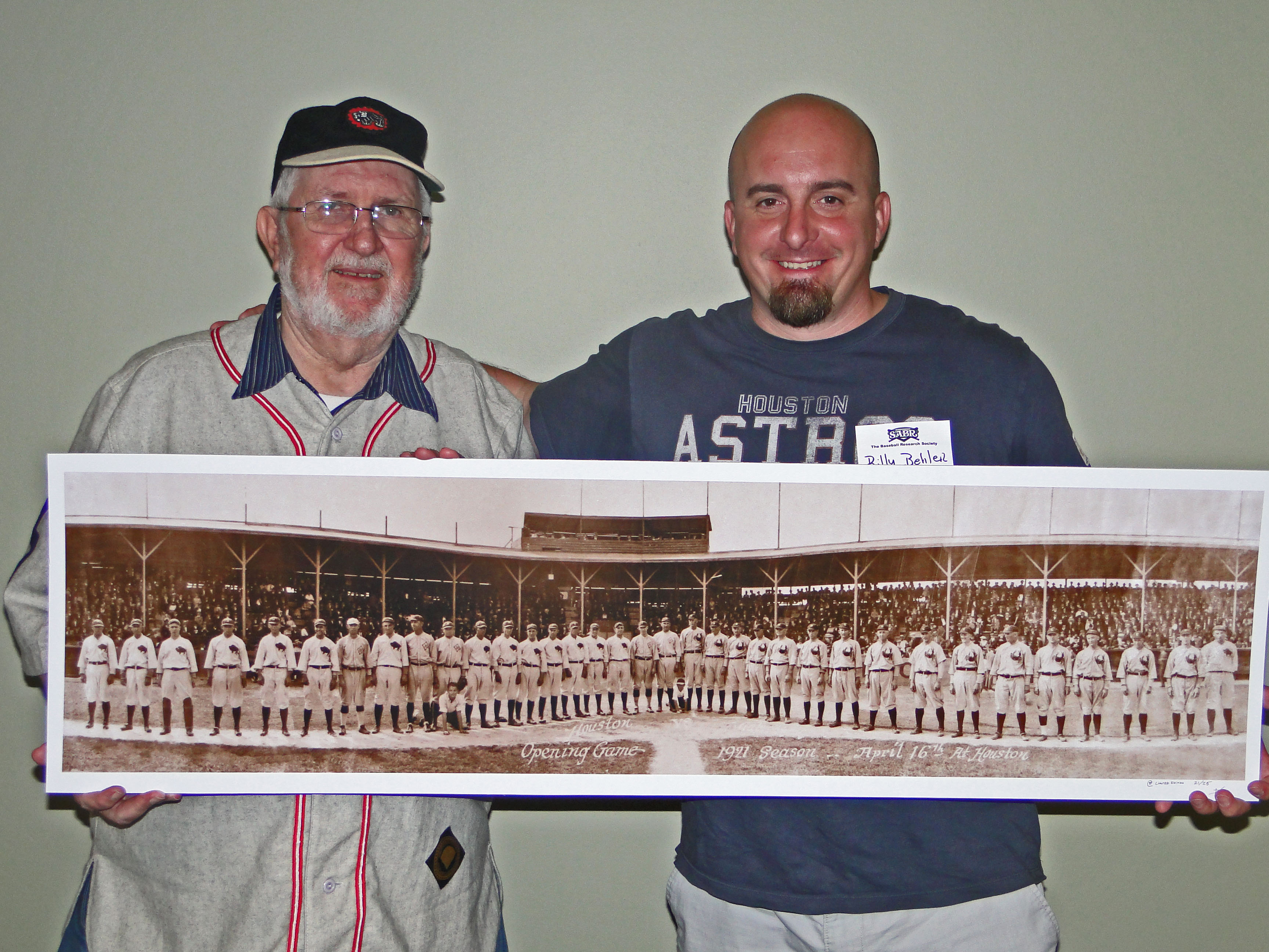 That’s me (L) with Billy Behler and the beautiful 1921 panorama of Opening Day at West End Park in Houston between the Houston Buffaloes and the Galveston Sand Crabs.