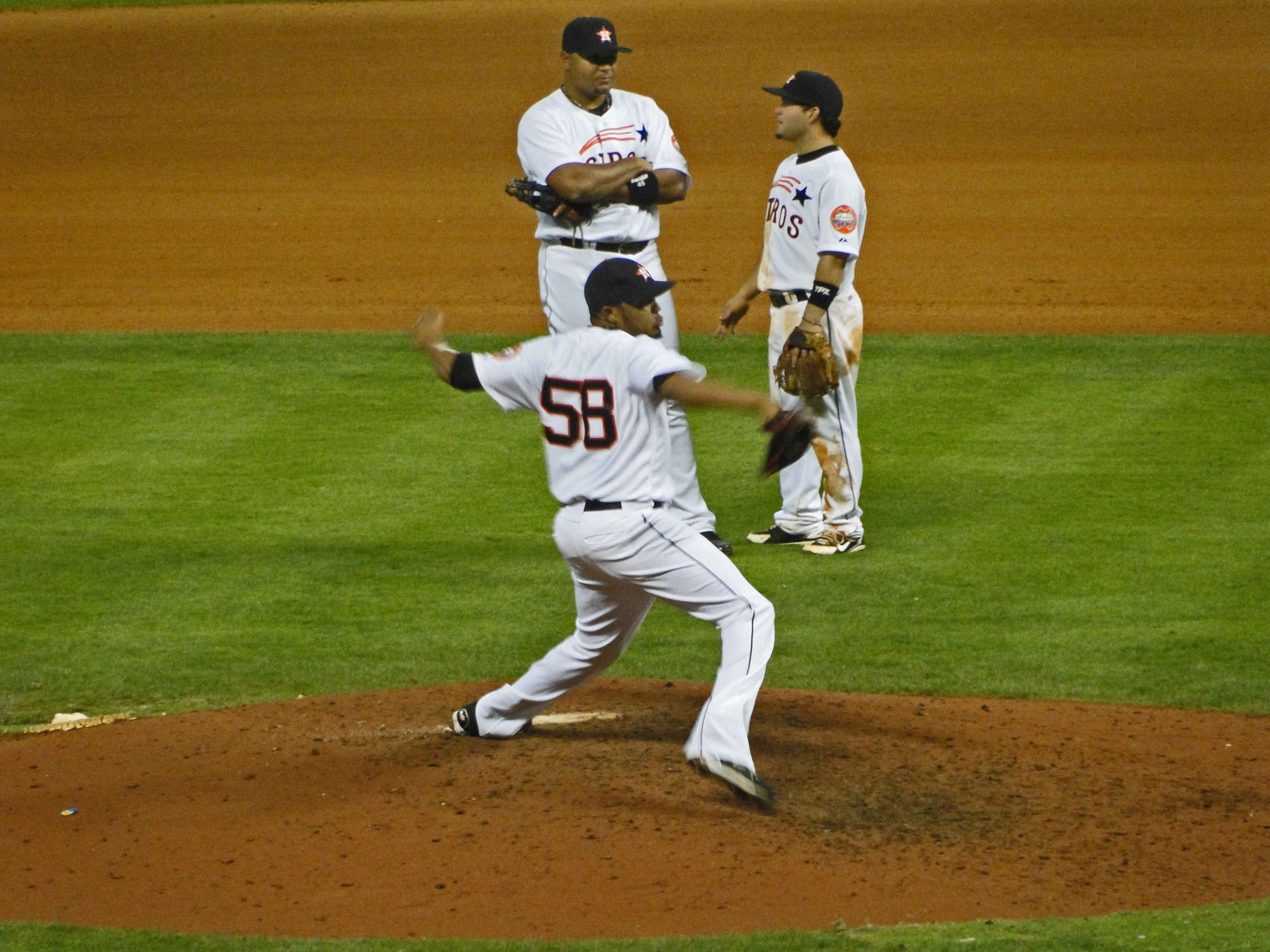 Fernando Abad warms up in 9th as Carlos Lee and Jose Altuve model their classic “shooting star” Astro threads. As for the game, the Astros pitched well, hit poorly.